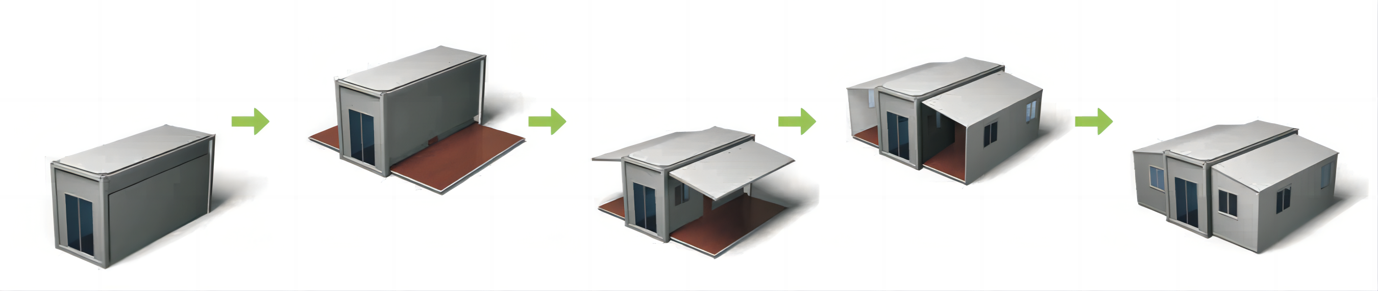 Folds into standard shipping container size for easy storage; expands outward on both sides to double or triple the usable area, balancing transport compactness and on-site spaciousness.